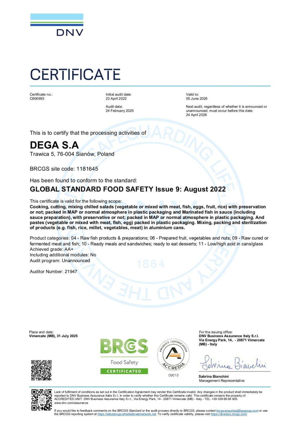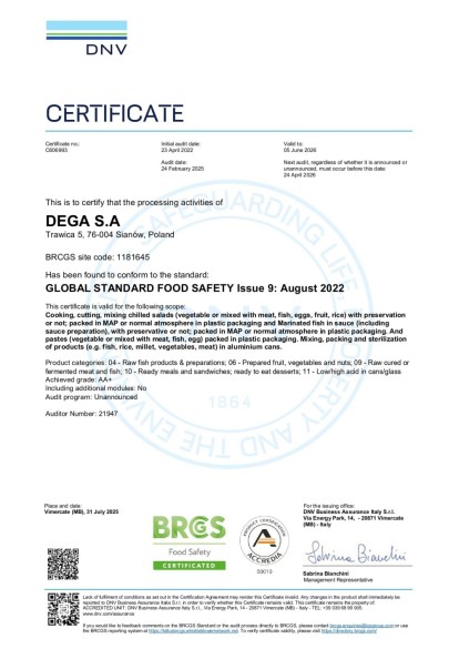 Dzięki konsekwentnie realizowanej polityce rozwoju od 2004 roku jesteśmy przedsiębiorstwem, które spełniło warunki niezbędne do konkurowania na rynku Unii Europejskiej. Corocznie przechodzimy pomyślnie kolejne audyty certyfikujące potwierdzające wdrożony i stosowany Zintegrowany System Zarządzania jakością na zgodność z wymaganiami standardów IFS Food i BRC Food Safety.